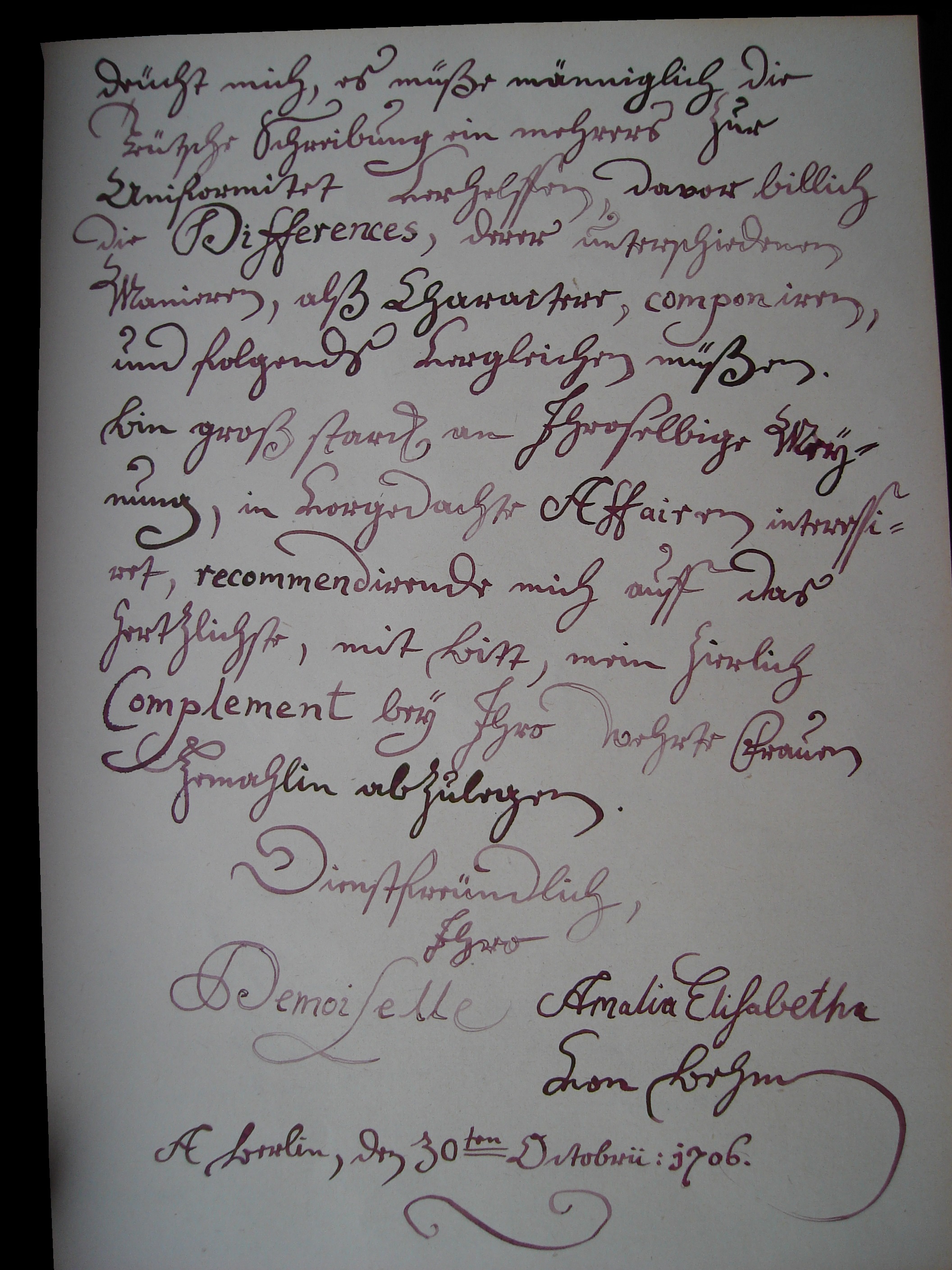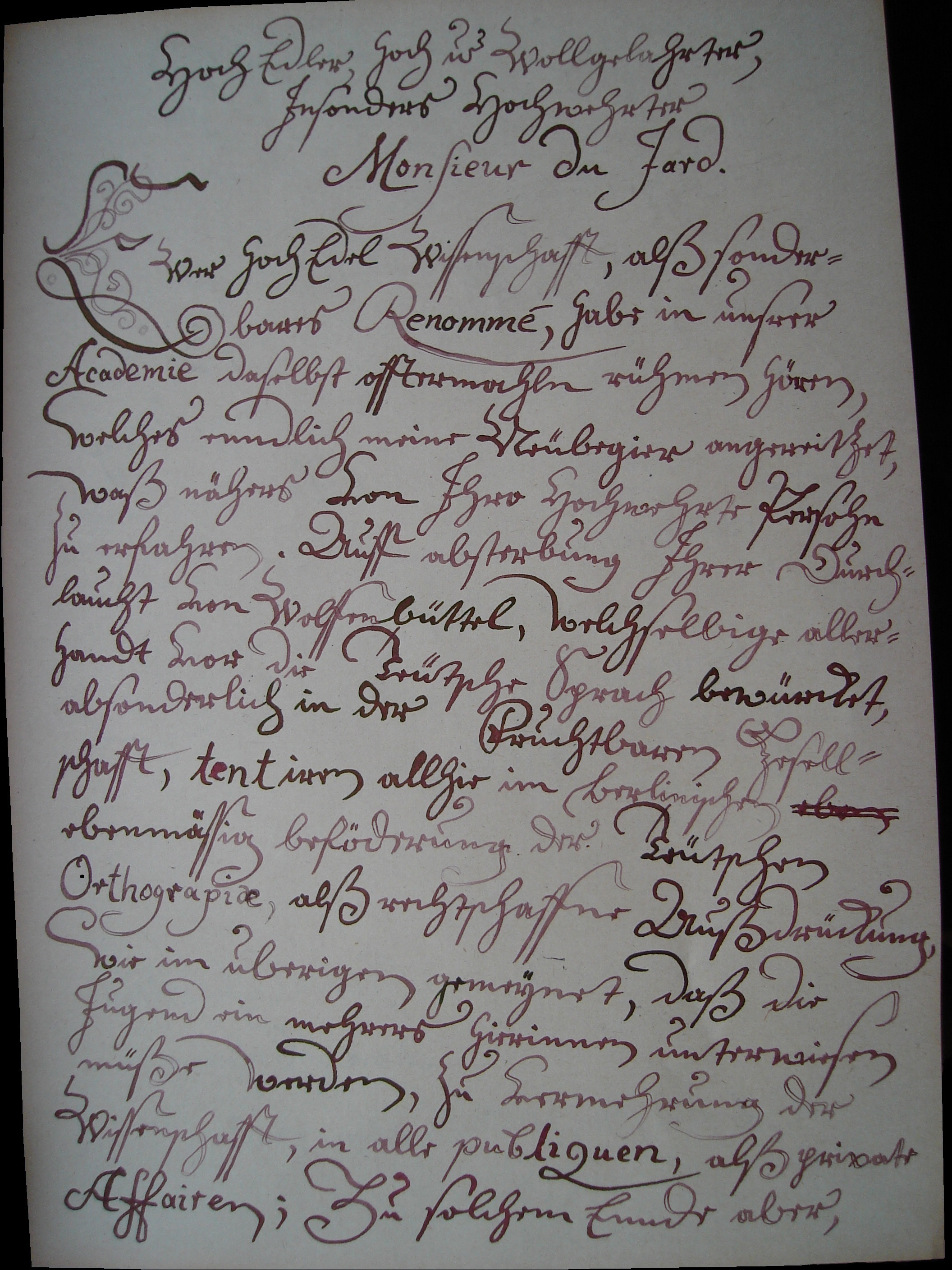 Hoch Edler, hoch u. Wollgelahrter, Jnsonders Hochwehrter Monsieur du Jard. EWer hochEdel Wissenschafft, alß sonderbares Renommé, habe in unsrer Academie daselbst offtermahln rühmen hören, welches enndlich meine Neübegier angereitzet, waß nähers von Jhro Hochwehrte Persohn zu erfahren. Auff absterbung Jhrer Durchlauch von Wolffenbüttel, welchselbige allerhandt vor die Teütsche Sprach bewürcket, absonderlich in der Fruchtbaren Gesellschafft, tentiren allhie im Berlinischen ebenmässig beförderung der Teutschen Orthographiae, alß rechtschaffne Außdrückung, wie im uberigen gemeynet, daß die Jugend ein mehrers hierinnen unterwiesen müße werden, zu vermehrung der Wissenschafft, in alle publiquen, alß private Affairen; Zu solchem Ennde aber, deücht mich, es müße männiglich die Teütsche Schreibung ein mehrers zue Uniformitet verhelffen davor billich die Differences, derer unterschiedenen Manieren, alß Charactere, componiren, und folgends vergleichen müßen. Bin groß starck an Jhroselbige Meynung, in vorgedachte Affairen interessiret, recommendirende mich auff das hertzlichste, mit Bitt, mein zierlich Complement bey Jhro wehrte Frauen Gemahlin abzulegen. Dienstfreündlich, Jhro Demoiselle Amalia Elisabetha von Behm - A Berlin, den 30ten Octobrii : 1706.