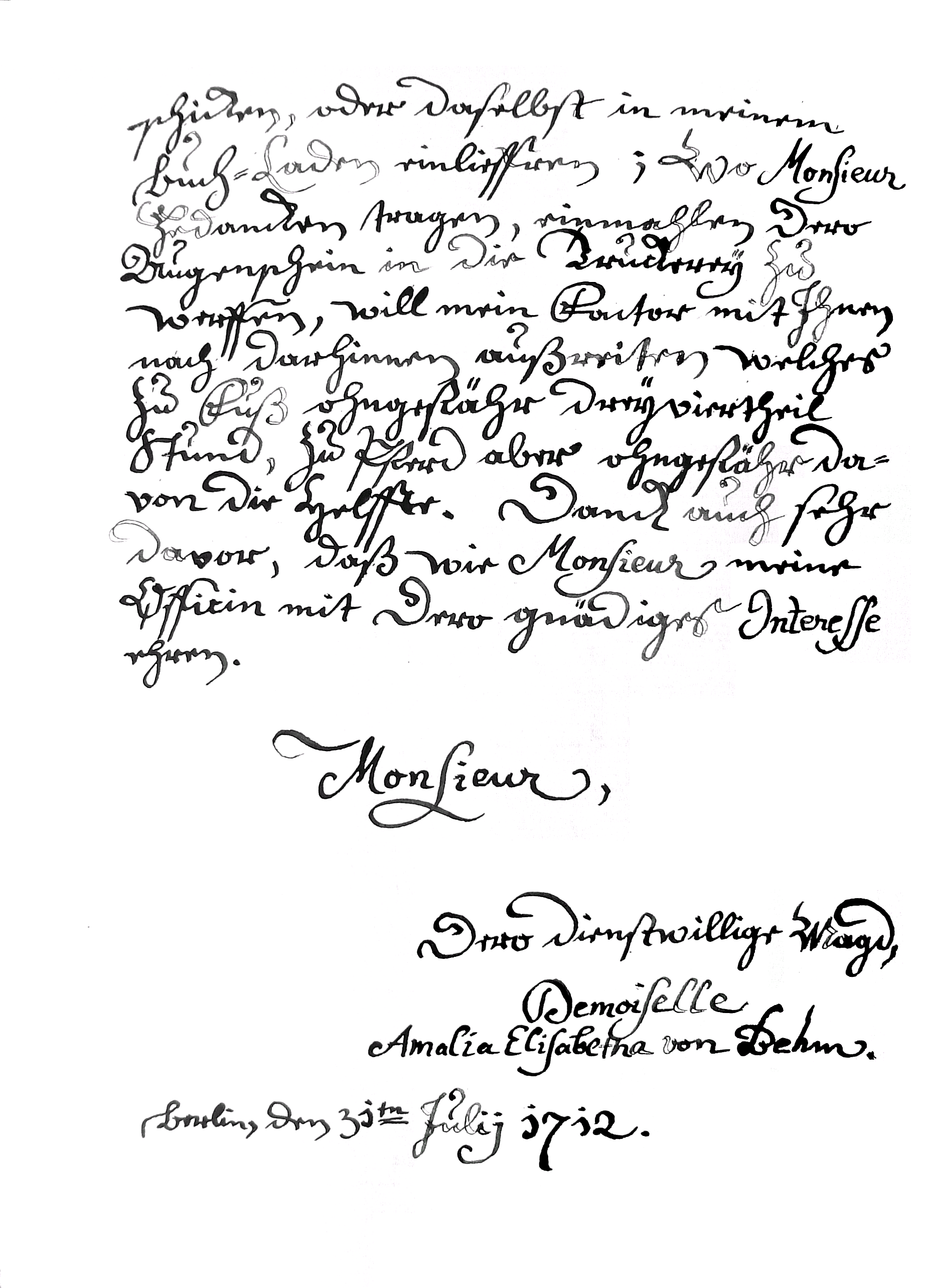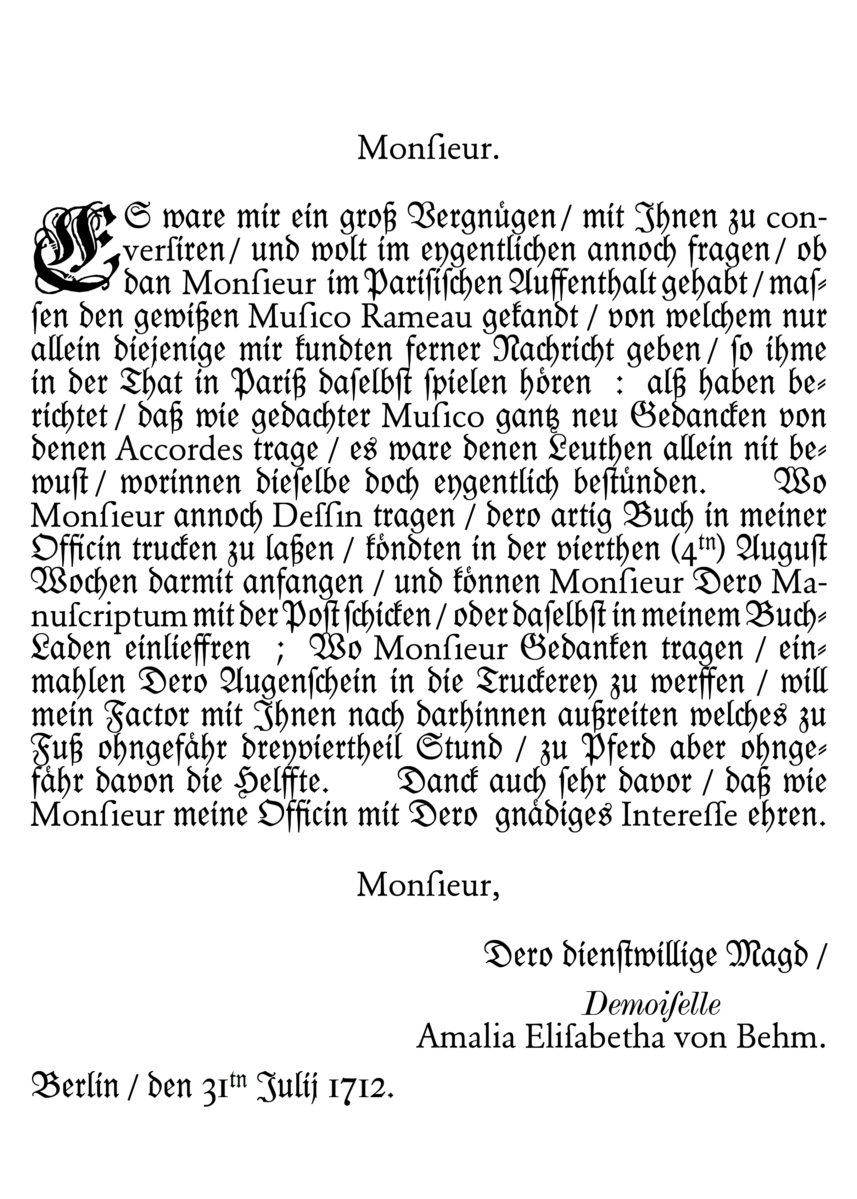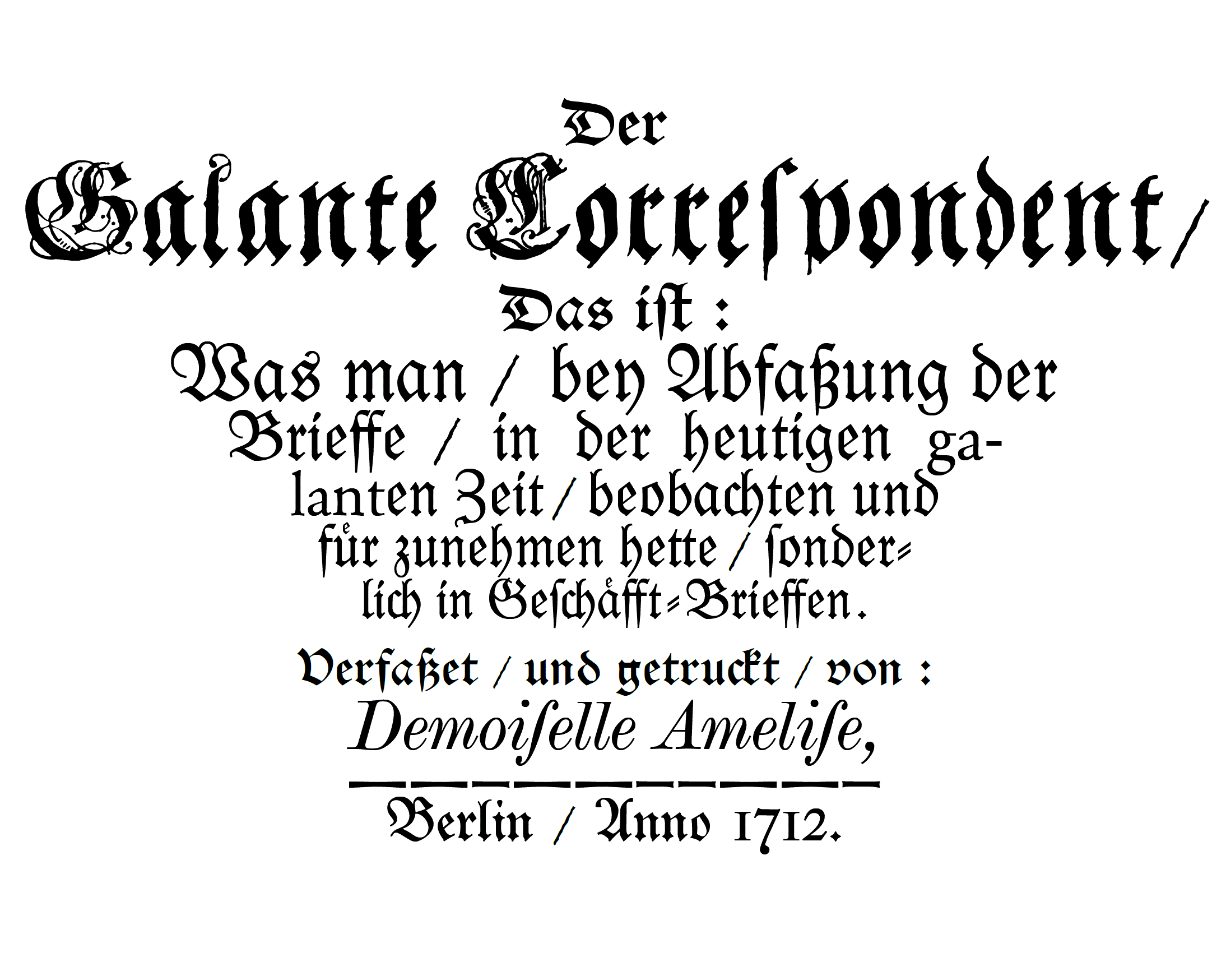 Der Galante Correspondent/ Das ist : Was man/ bey Abfaßung der Brieffe/ in der heutigen galanten Zeit/ beobachten und für zunehmen hette/ sonderlich in Geschäfft-Brieffen. Verfaßet/ und getruckt von : Demoiselle Amelise, Berlin/ Annno 1712.