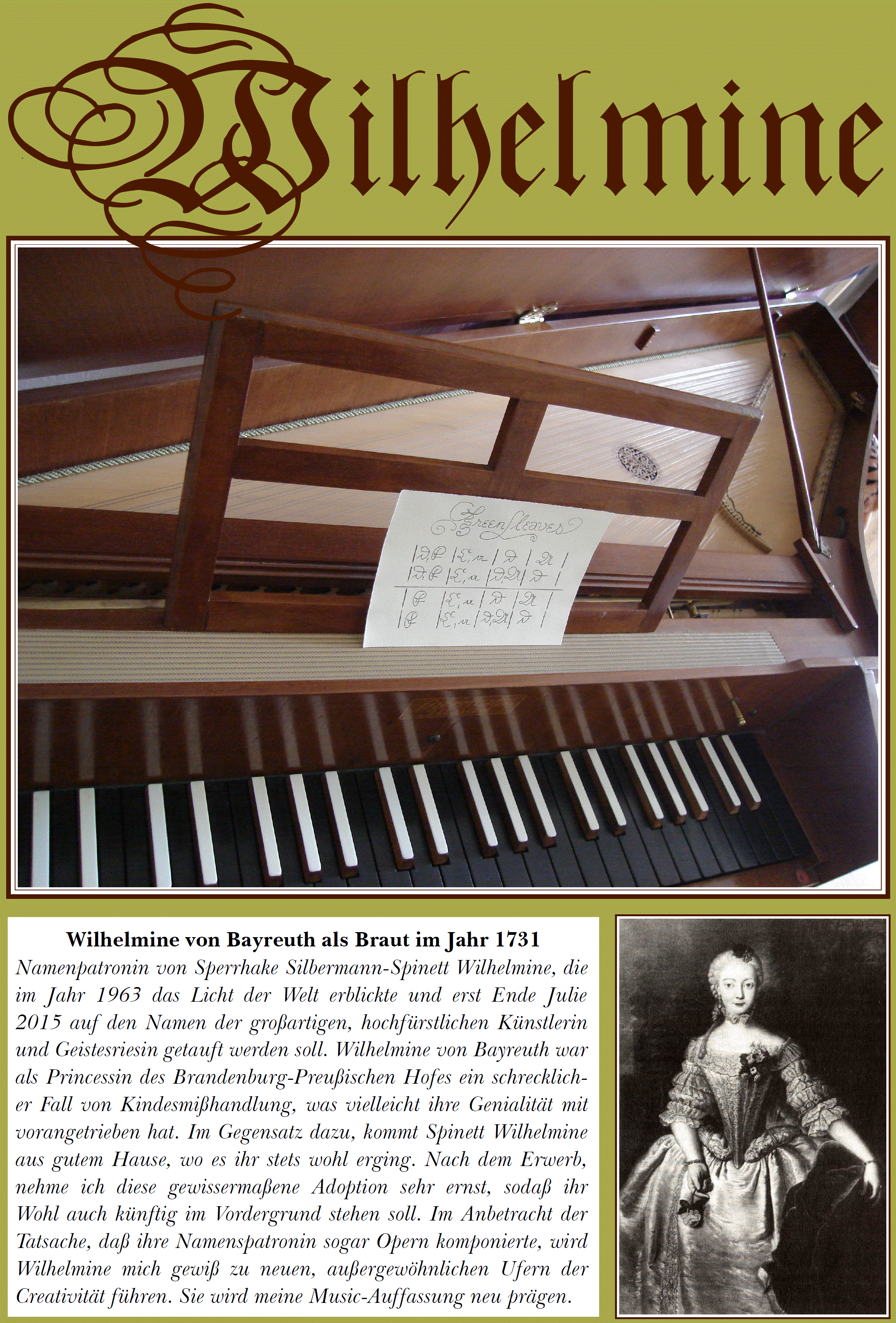 Bild unten: Wilhelmine von Bayreuth als Braut im Jahr 1731 - Namenpatronin von Sperrhake Silbermann-Spinett Wilhelmine, die im Jahr 1963 das Licht der Welt erblickte und erst Ende Julie 2015 auf den Namen der großartigen, hochfürstlichen Künstlerin und Geistesriesin getauft werden soll. Wilhelmine von Bayreuth war als Princessin des Brandenburg-Preußischen Hofes ein schrecklicher Fall von Kindesmißhandlung, was vielleicht ihre Genialität mit vorangetrieben hat. Im Gegensatz dazu, kommt Spinett Wilhelmine aus gutem Hause, wo es ihr stets wohl erging. Nach dem Erwerb, nehme ich diese gewissermaßene Adoption sehr ernst, sodaß ihr Wohl auch künftig im Vordergrund stehen soll. Im Anbetracht der Tatsache, daß ihre Namenspatronin sogar Opern komponierte, wird Wilhelmine mich gewiß zu neuen, außergewöhnlichen Ufern der Creativität führen. Sie wird meine Music-Auffassung neu prägen.